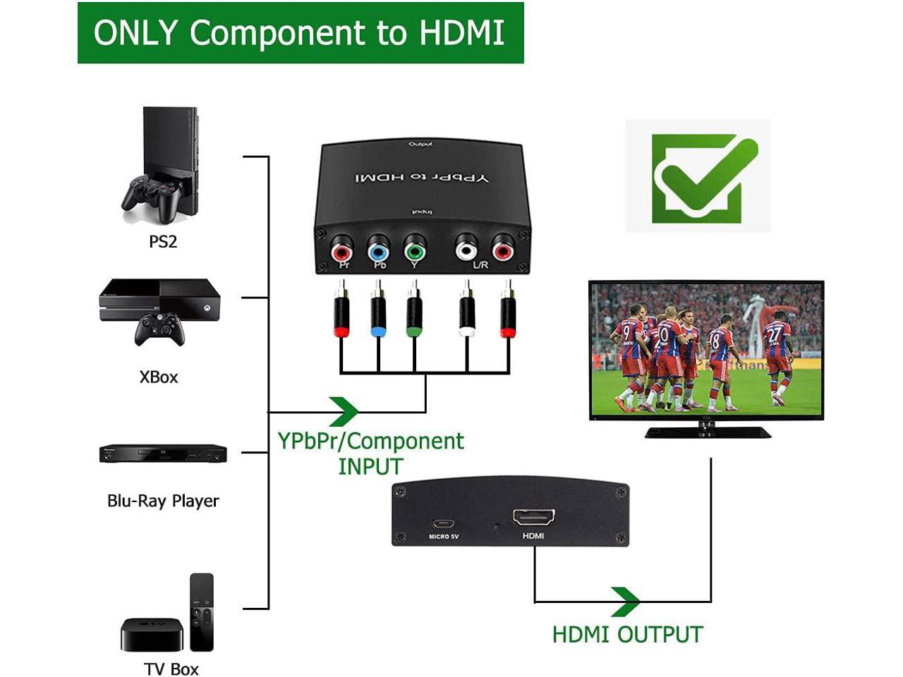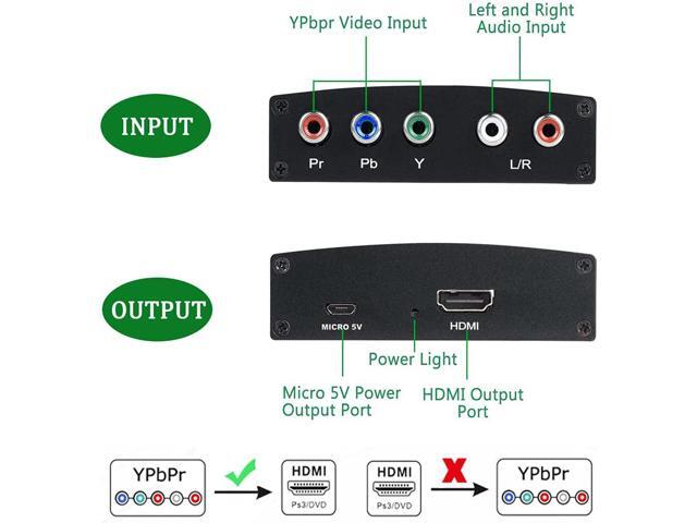 - The component video(ypbpr) to HDMI converter enables you to connect your ypbpr old DVD player or game console/ Xbox 360 to your new HDMI display. Support the highest video resolution up to 1080P(max). Easy to install and simple design. Plug and play, no software is needed.
