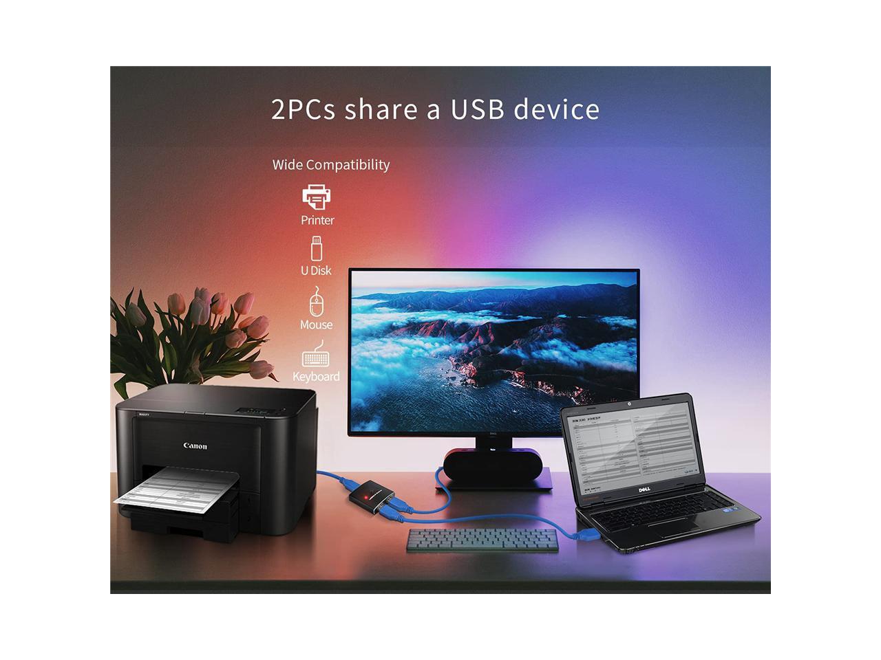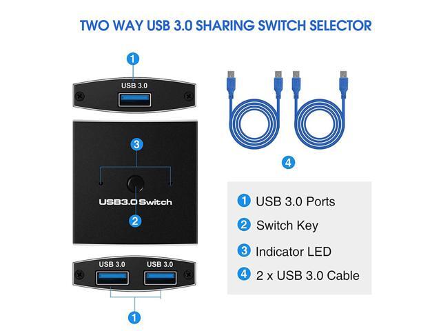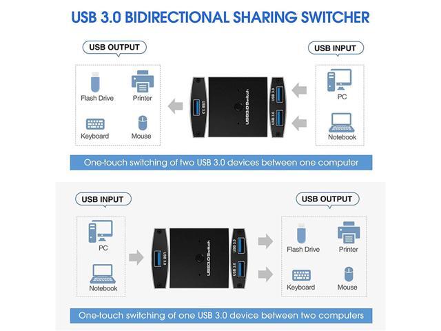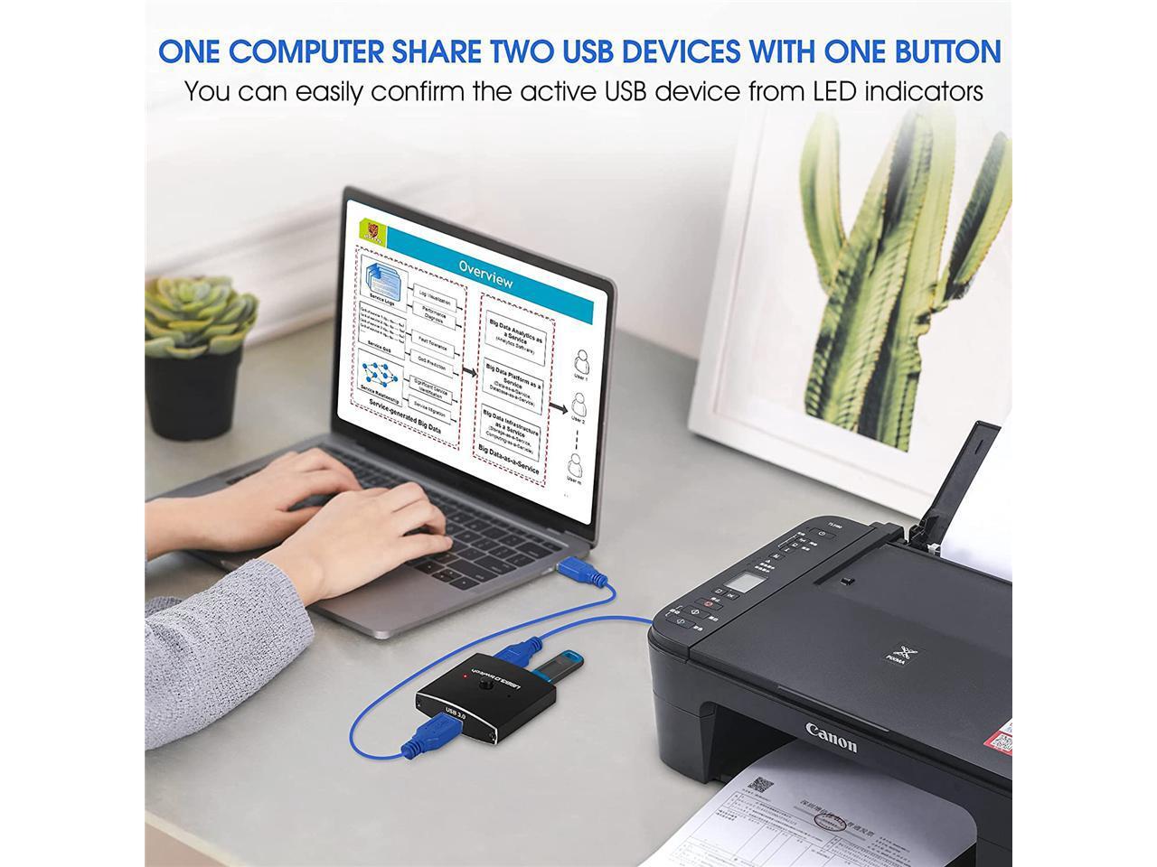 - Reduce repeated plugging and unplugging, and easily improve work efficiency.USB3.0 sharing switch can allow two computers share 1 USB device or one computer share 2 USB devices. The data transfer rate CAN up to 5 Gbps without constantly swapping cables or set up complicated network sharing software. It's a great for use at office or home if you need to switch between computers.