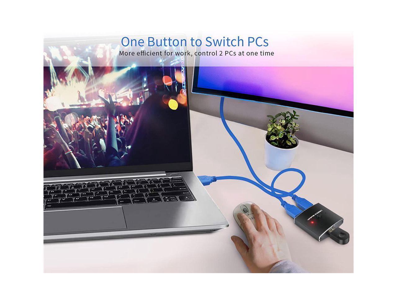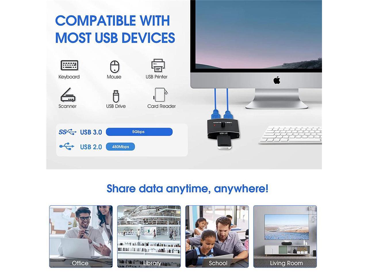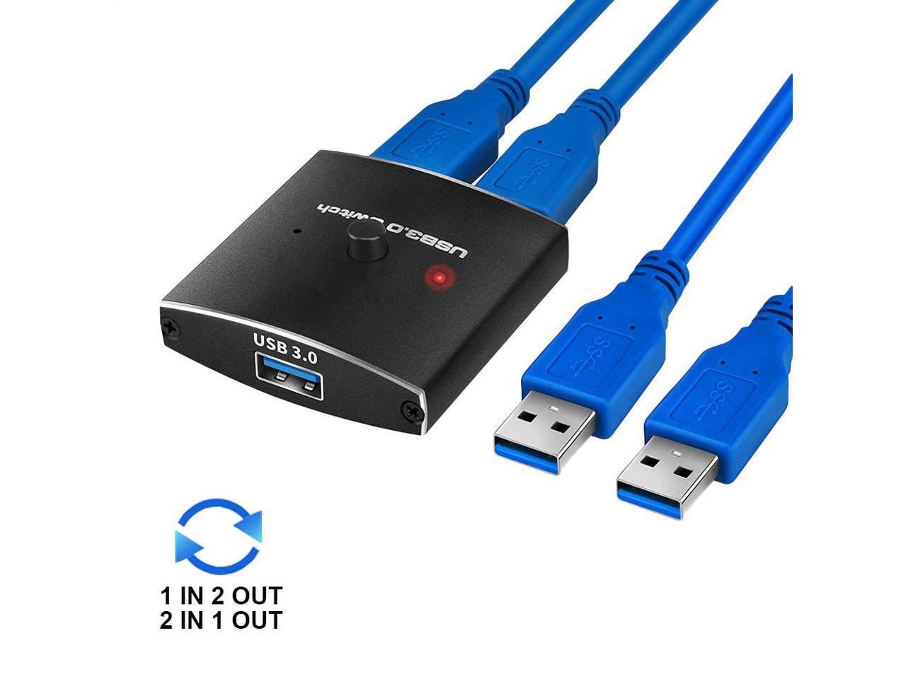 - Reduce repeated plugging and unplugging, and easily improve work efficiency.USB3.0 sharing switch can allow two computers share 1 USB device or one computer share 2 USB devices. The data transfer rate CAN up to 5 Gbps without constantly swapping cables or set up complicated network sharing software. It's a great for use at office or home if you need to switch between computers.