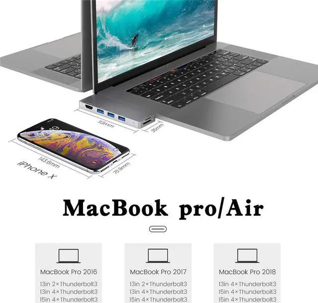 Aluminum macbook usb adapter, compact and stylish, perfectly extending the ports of your MacBook Pro/Air to one 4K HDMI, USB-C power delivery, USB-C data transfer, three USB 3.0 and Micro SD/SD card reader ports.