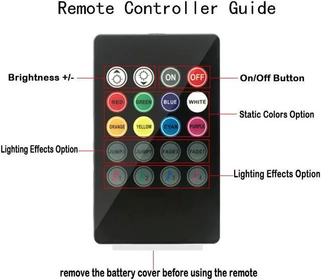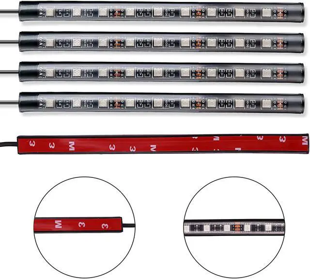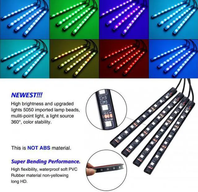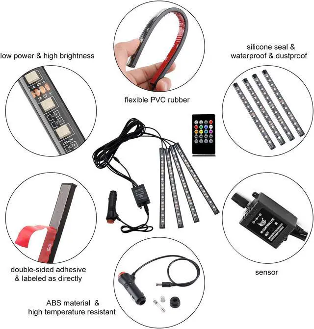 Sound-activated and Remote control---- 4 kinds of music effects control mode, 8 kinds of color control, brightness control, ON / OFF, 2-hop mode control, fade out 2 mode control. Remote control not only can easy switch the led mode and adjust the brightness as you wish, but also sound-activated allows you enjoy the fun with the color changing following your car stereo music rhythm.