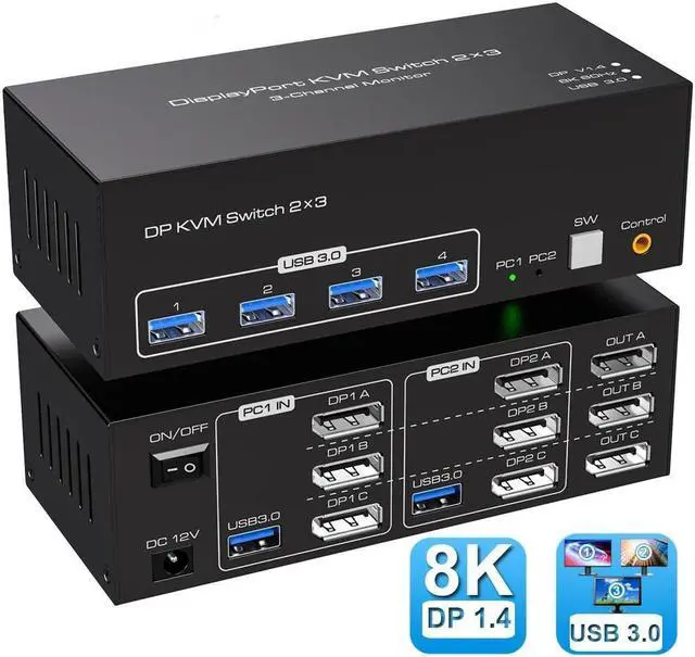 - 3 Channel Displayport INPUT 3 Monitor KVM Switch: This 3 monitor kvm perfect for hooking up 2 desktops or laptops to share one set of keyboard, mouse and 3 monitors for extended, mirror display; Perfect for computers with 3 DP monitor for the display outputs. It requires every Laptop/PC support 3 screen or above display functions and must support extended display.