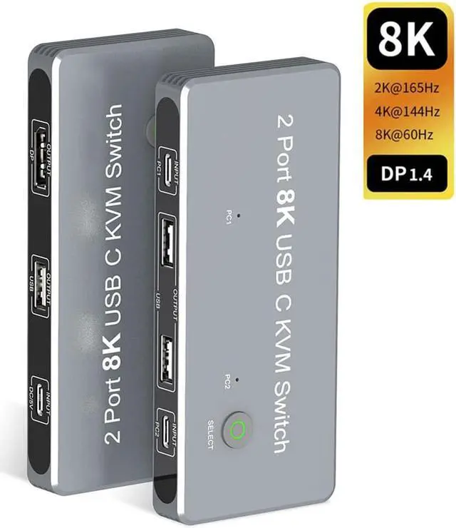 - USB-C 8K KVM Switch with one DisplayPort 1.4 Port for Video,with this 2 Port 8K KVM Switcher,you are able to connect from the switcher's two PC Input Port to your USB-C PC/Laptops via two standard USB-C Gen-2 Cable,then connect from the switcher's Standard DP 1.4 Port to your DisplayPort Monitors via your own displayport 8k Standard Cable,you can press the "select"button to switch between two of your PCs.Note:You must plug our USB C to USB A cable to power the switcher while working