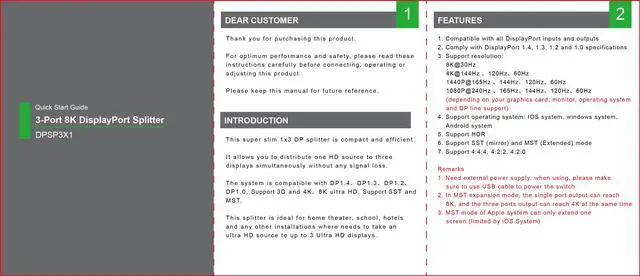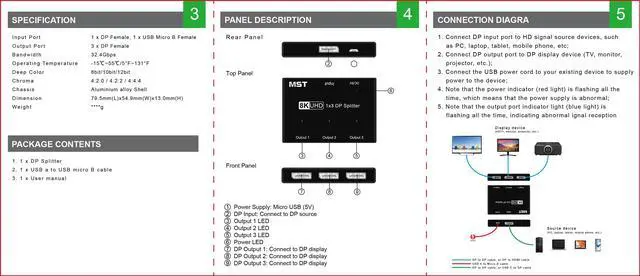 NEW 1x3 DisplayPort Splitter: Split one DP signal into 3 signals. Supports output of 3 same screens in mirror mode or 3 different screens in MST mode. In MST expansion mode, the single port output can reach 8K@30Hz 4K@144Hz, and the three ports output can reach 4K@60Hz at the same time .MST mode of Apple system can only extend one screen (limited by iOS System) .when using, please make sure to use USB cable to power the Splitter switcher.