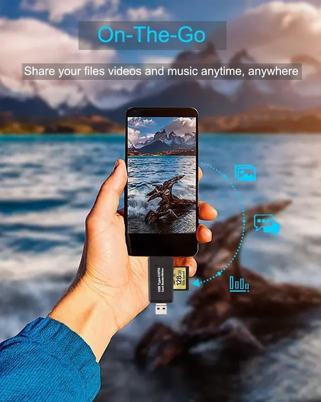 On-The-Go Date: Support on all OTG device. Playback videos/music directly from external memory without occupying space on Device. Share video or picture to your families or friends in anytime anywhere. (NOTICE: The Card Reader is NOT compatible with iPhone or iPad)