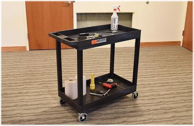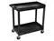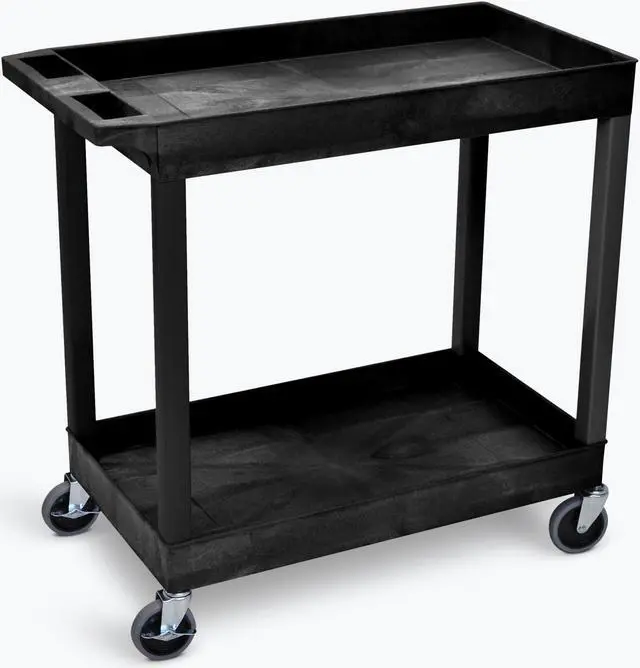 With two large tub shelves that are 2.5" deep, this multipurpose utility cart easily holds and hauls a wide range of items and is designed to carry loads up to 200 lbs. The tub shelves are made of a high-density polypropylene, known for its incredible strength-to-density ratio, which assures that each cart is durable without being bulky or cumbersome. Easily guide the cart across indoor and outdoor environments using the ergonomic push handle and full-swivel casters; simply engage the two locking brakes when you need to keep the cart stationary. Two tub shelf cart suits warehouses, shops, garages, cafes, or offices. Molded plastic shelves and legs will never rust, dent, scratch or stain. HDPE (high-density polyethylene) shelves; PVC legs. 33% more capacity than standard 24"W x 18"D carts. Shelves safely transport goods in 2.5"-deep tub area.