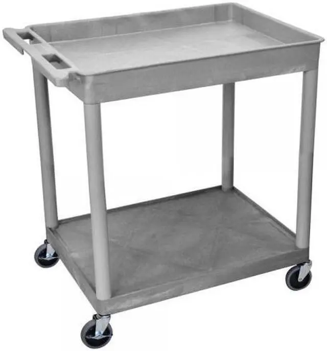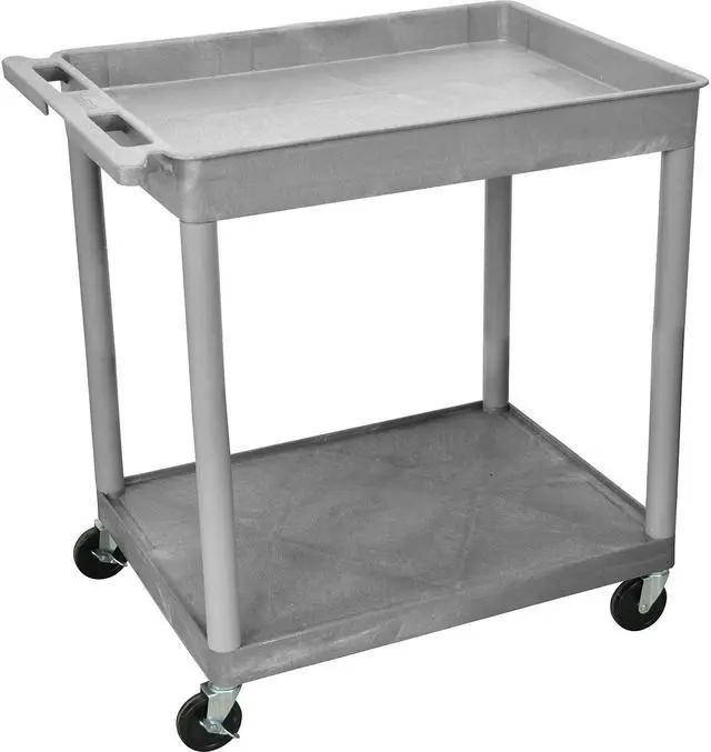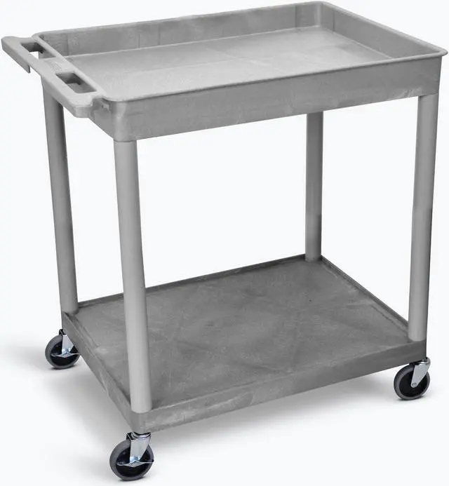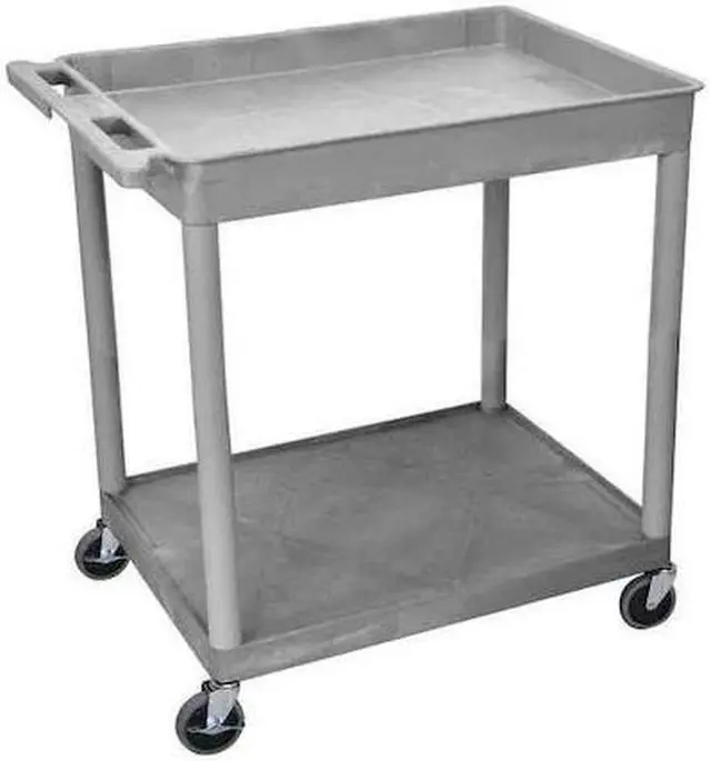 The Luxor 32 x 24" Heavy-Duty Utility Cart is a feature-filled, multi-purpose mobile cart. With four 4" casters (two locking), a 25" shelf-clearance, a single 2-3/4" deep top tub and a flat bottom shelf, this utility cart provides easy movement and storage for all of your supplies. A push-handle is molded into the top shelf to ensure easy turns. The neutral gray finish allows this cart to fit into any decor. The Luxor lifetime warranty is also included.• Gray Color• 400 lb. Weight Capacity