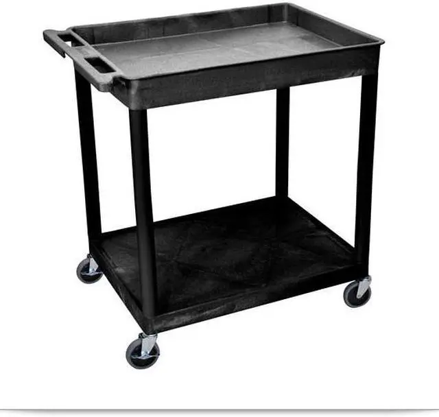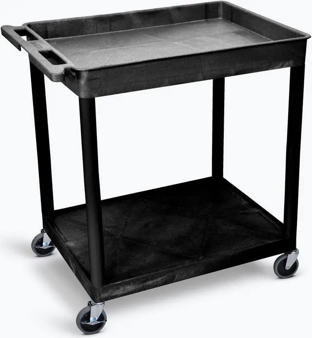 The Luxor 32 x 24" Heavy-Duty Utility Cart is a feature-filled, multi-purpose mobile cart. With four 4" casters (two locking), a 25" shelf-clearance, a single 2-3/4" deep top tub and a flat bottom shelf, this utility cart provides easy movement and storage for all of your supplies. A push-handle is molded into the top shelf to ensure easy turns. The neutral black finish allows this cart to fit into any decor. The Luxor lifetime warranty is also included.• Black Color• 400 lb. Weight Capacity