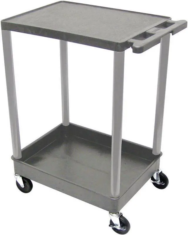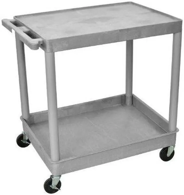 The Luxor TC21 32 x 24" Two Shelf Heavy-duty Utility Cart is an easy and quiet rolling cart. The cart is made of polyethylene and has a lifetime warranty. It has a top flat shelf and a 2 3/4" deep tub shelf. The clearance is 25" between each shelf. The top shelf is reinforced with a steel bar. The cart is transported by a push handle molded into the top shelf and four 4.0" casters, two with a locking brake.• Gray Shelves/Gray Legs• 400 lb. Weight Capacity• Top Shelf Flat/Bottom Tub