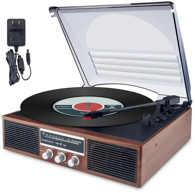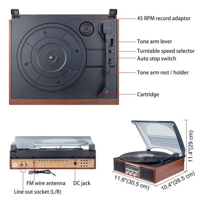 The vinyl record player has adjustable 3 speeds (33, 45, 78 RPM) for all your 7,10,12 inches vinyl records. Auto-Stop design stops the platter automatically at the end of a record to prevent damage to your records.
