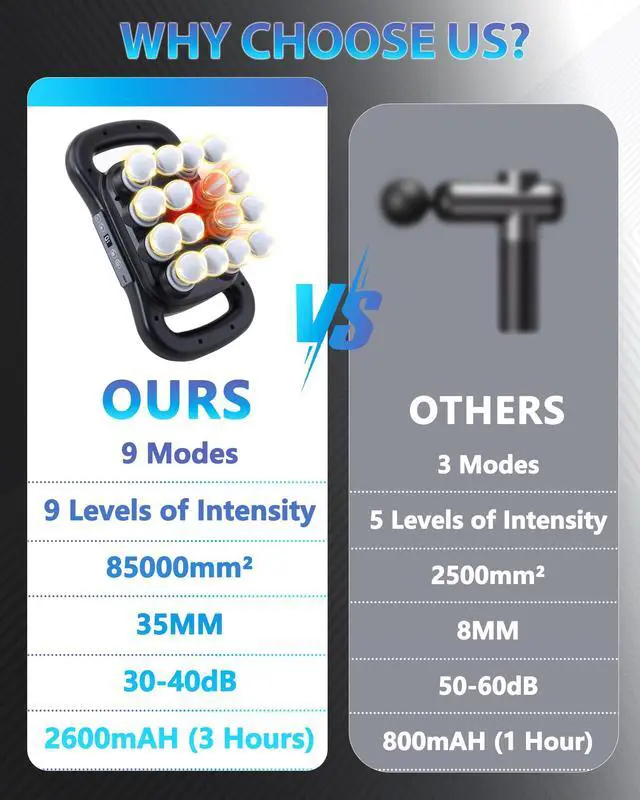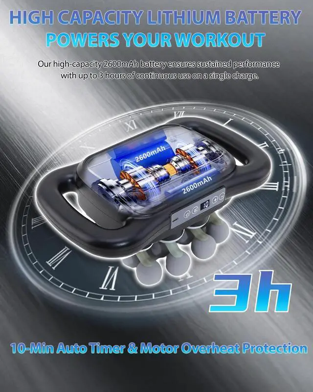 Extended Battery Life & Fast ChargingEquipped with a high-capacity 2600mAh battery, this 16-head massage gun provides up to 4 hours of continuous operation on a single charge; The massage gun multiple heads design ensures long-lasting power for extended recovery sessions.