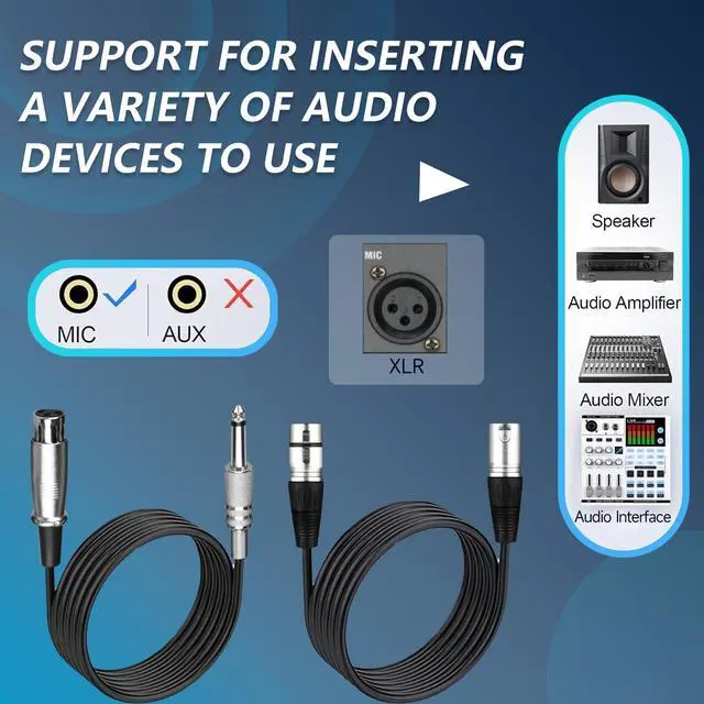 Professional Two XLR Cable with 3.5mm AdapterUsing XLR cable can better transmit audio and make the sound perfectly displayed. 16.4 XLR Male to Female and 16.4 XLR to 6.35mm cable and 3.5mm adapter can be used in any occasion and any audio productnotecan not put in AUX)