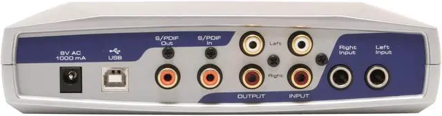| Features | up to 24-bit/96kHz performance 2 pairs of line-level audio inputs (1/4" TS and RCA) 2 line-level audio outputs (RCA) with level control knob S/PDIF digital I/O (coaxial) with 2-channel PCM digital I/O supports surround-encoded AC-3 and DTS passthrough 1x1 MIDI I/O headphone output (1/4" TRS) with level control knob AC-powered for high performance A/D and D/A includes Ableton Live Lite 4 music production software, so you can make music right away |