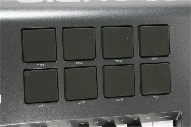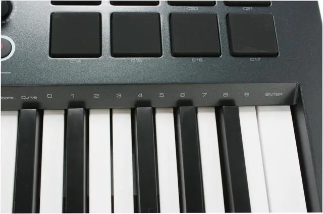 | Features | 25-key velocity-sensitive semi-weighted action keyboard with assignable aftertouch 8 MIDI-assignable trigger pads 8 MIDI-assignable rotary encoder knobs 6 transport buttons reassignable to other MIDI parameters assignable pitch bend and modulation wheels octave up/down; transpose up/down preset / program change / MIDI channel +/- buttons backlit LCD screen sustain and expression pedal jacks built-in USB MIDI interface including standard MIDI In and Out jacks powered via USB or optional power supply class-compliant with Windows XP and Mac OS X 20 non-volatile memory locations memory dump via Sys Ex compatible with free Enigma librarian/editor for storing and organizing setups all controllers fully programmable to MIDI controller number and channel Controller Mute function mutes controller output to avoid parameter jumps Snapshot function transmits all current controller settings on/off rocker switch weighs only 6 lbs. includes Ableton Live Lite 4 music production software so you can make music right away |