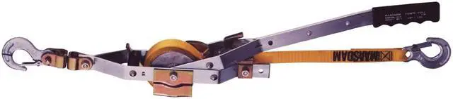 | Features | * Strap puller * Precision-cast aluminum alloy ratchet wheel-one piece construction * Galvanized, aircraft quality cable * Interlocking, precision fit, steel alloy pawls with safety spacer sleeve * Cold rolled, high strength, tempered steel frame and handle * Drop-forged steel slip hooks with OSHA recommended safety latches * Heavy gauge steel, reinforced ratchet guard * Aircraft-type heat treated bolts * High tensile strength and fully rotating steel swivel * Trouble free "Notch-At-A-Time" letdown * Permanent, comfortable, non-slip grip * 1" strap width * 12' strap length * 11' 6" maximum lift * 1 ton capacity |