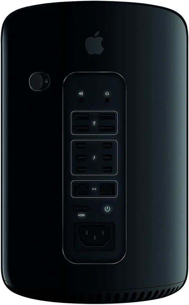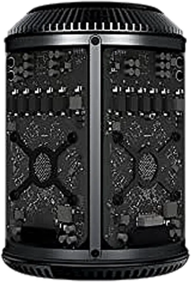 Apple Mac Pro (Gray Cylinder) There is no mistaking the "Late 2013" Mac Pro models for earlier ones as they present an Apple described "radical" departure from the large, highly expandable tower case design of yore and instead feature a compact dark gray, glossy cylinder design that is approximately one eighth of the mass but has limited internal expansion. Apple explains that these "Space Gray" cylinder Mac Pro models are "designed around an innovative unified thermal core" and have not only faster processors than earlier models but also dual workstation class graphics processors, faster memory, and faster PCIe 2.0 x4 flash storage.