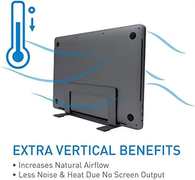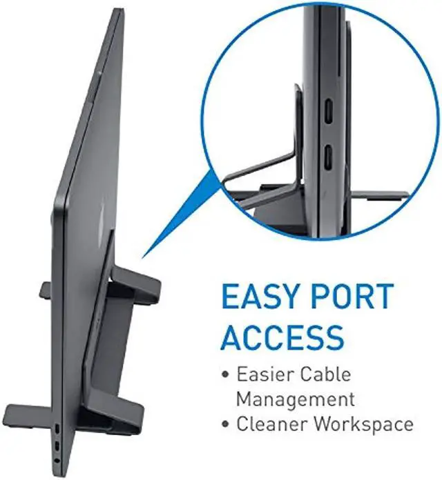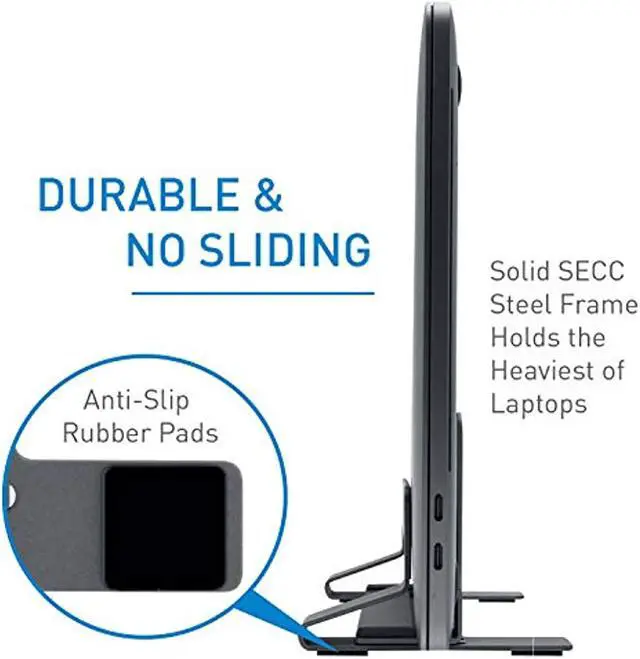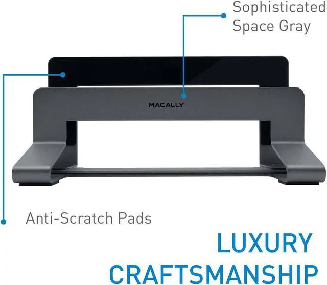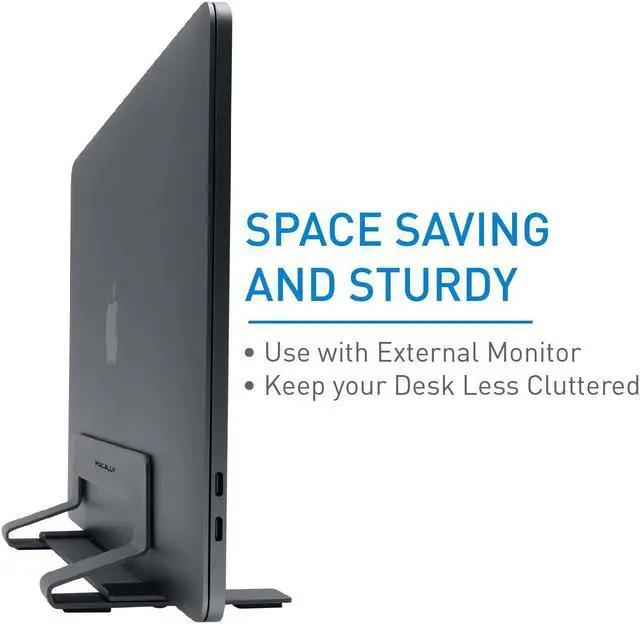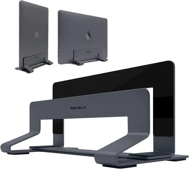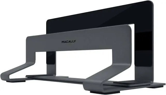 Vacally VCSTAND Space Saving and Stylish Steel Stand for MacBook- MacBook Air- MacBook Pro and any Laptop between .63- and 1.19- (1.6 cm to 3 cm) - Space gray. With the stylish aluminum Macally vertical VCSTAND you can work on your laptop while it-s closed and in upright position to maximize your minimal/valuable desk space.-The stand is made of high quality and solid SECC steel and has a wide non-slip rubber base to make sure that your laptop stands securely on your desk. Soft padded interior lining to hold your laptop securely and protect it from scratches.