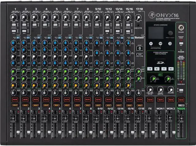 The mixer's full-color display and single-knob interface allow easy navigation of FX parameters and onboard SD recording and playback. Bluetooth streaming capabilities let you pair your Bluetooth-enabled device and stream audio directly to a channel on the mixer. The Onyx16 mixer is also equipped with a powerful mixing toolkit, including a 3-band Perkins EQ with On/Off hard bypass switch on all channels, Hi-Z switches for direct connection of guitars and other instruments, and a 100Hz low-cut filter and 48V phantom power on all mic channels. Designed with a rugged chassis and professional design, the Onyx16 mixer features backlit Mute and Solo buttons, a sealed rotary encoder, and high-visibility, high-contrast controls.