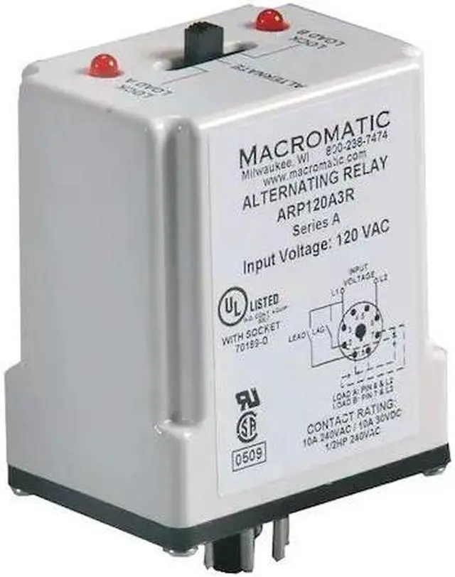Alternating Relay, Base Shape Octal, Coil Voltage 240V AC, Contact Form DPDT, Contact Rating (AC) 10 A @ 240V, Contact Rating (DC) 10 A @ 24V, Flat Pin Width Not Applicable, Number of Pins 8, Operating Modes Alternate, Always Energize Load 1, Always Energize Load 2, Status Indicator LED Indicates Next Load to Energize, Alternating Mode Selection Method Selector Switch, Burden Less than 3VA, Mounting Style Plug-In, Power Consumption 3 VA, Body Depth 2.9 in, Body Height 2.4 in, Body Width 1.7 in.