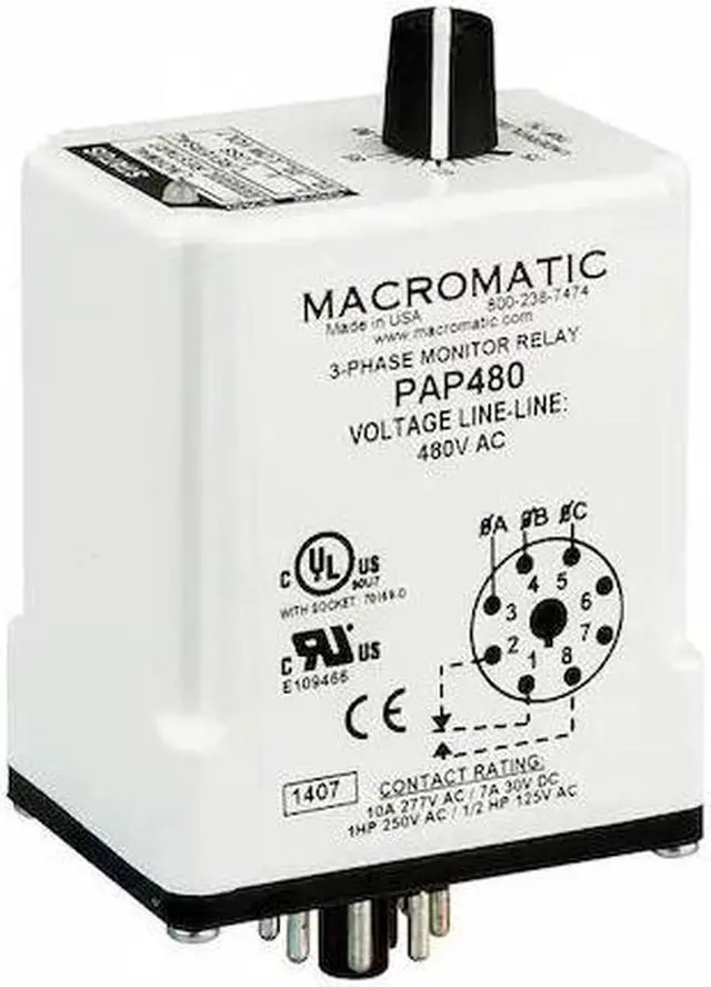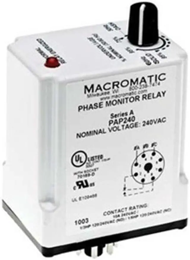 Phase Monitor Relay, Base Shape Octal, Contact Form SPDT, Contact Rating (AC) 10 A @ 277V, Contact Rating (DC) 7 A @ 30V, Current Rating 10 A, Input Voltage 240V AC, Monitored Parameters Phase Loss, Phase Reversal, Undervoltage, Number of Pins 8, Restart Auto, Restart Time Delay 1 sec, Mounting Style Plug-In, Body Depth 2.9 in, Body Height 2.4 in, Body Width 1.7 in, Electrical Operating Durability 100, 000, For Use With Sensors, Frequency 50/60 Hz, Maximum Operating Temperature 149 Degrees F.