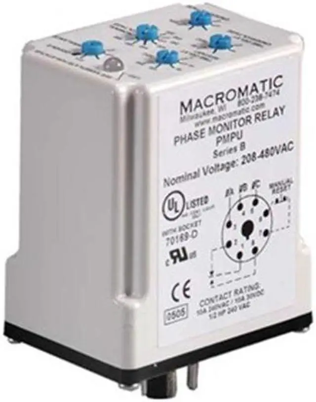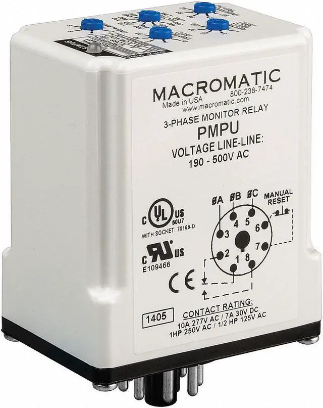 Phase Monitor Relay, Base Shape Octal, Contact Form SPDT, Contact Rating (AC) 10 A @ 277V, Contact Rating (DC) 7 A @ 30V, Current Rating 10 A, Input Voltage 190 to 500V AC, Monitored Parameters Overvoltage, Phase Loss, Phase Reversal, Phase Unbalance, Undervoltage, Number of Pins 8, Restart Auto, Manual, Restart Time Delay 1 to 300 sec, Mounting Style Plug-In, Body Depth 2.9 in, Body Height 2.4 in, Body Width 1.7 in, Electrical Operating Durability 100, 000, For Use With Sensors.