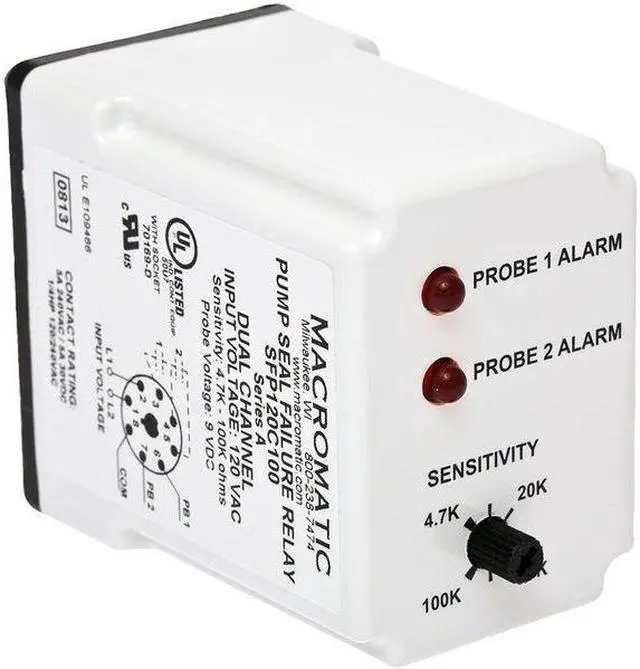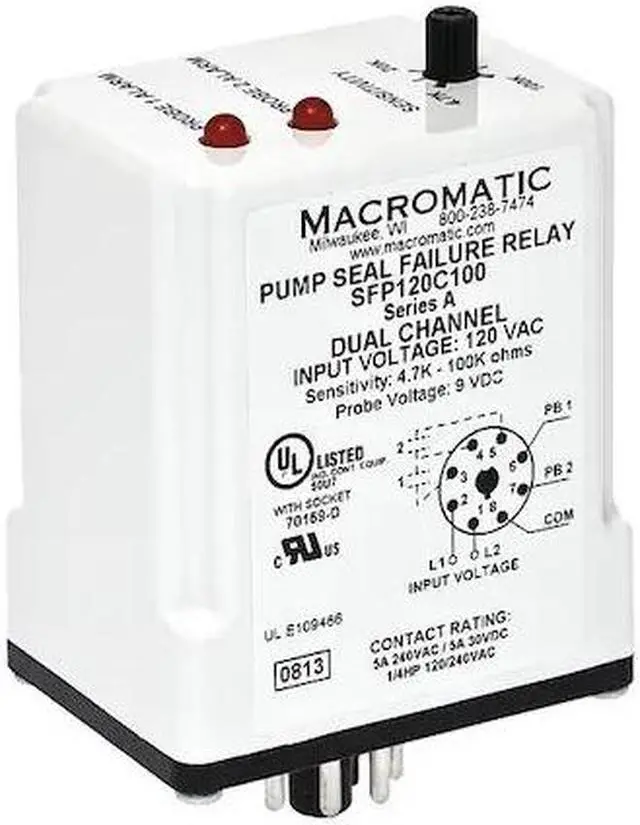 Pump Seal Failure Relay, Contact Form SPST-NO, Current Rating 5 A, Electrical Connection 8-Pin Terminal, Input Voltage 120V AC, Number of Channels Dual Channel, Number of Pins 8, Relay Function Seal Leakage, Seal Leak Minimum Resistance 4, 700 ohm, Seal Leak Maximum Resistance 100, 000 ohm, Status Indicator LED Indicator, Contact Rating (AC) 5 A @ 240V, Contact Rating (DC) 5 A @ 28V, Mounting Style Plug-In, Adjustment Method Rotary Knob, Base Shape Octal, Body Depth 2.9 in, Body Height 2.33 in.