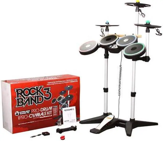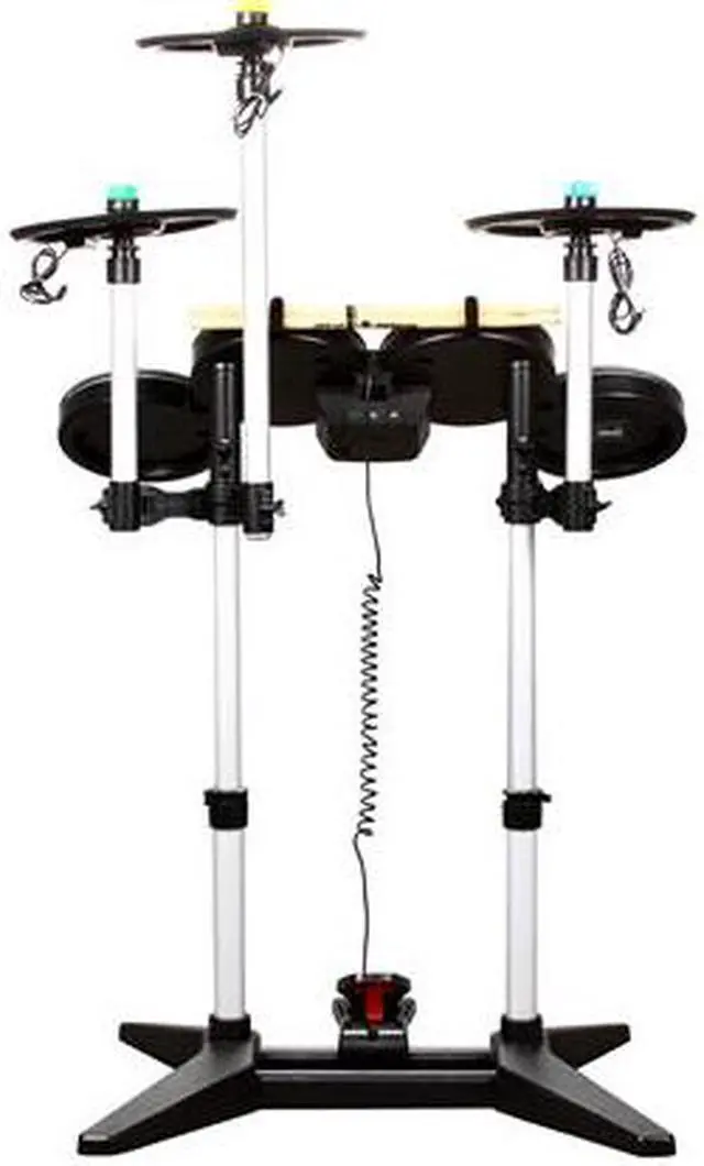 | Features | Add another layer of authenticity to your rock experience with the all-inclusive Rock Band 3 Wireless PRO-Drum & PRO-Cymbals Kit. With four durable drum pads and a metal-reinforced kick pedal, the drum kit can withstand strikes from the most enthusiastic drummers. Velocity-sensitive drumheads respond to the force exerted on them and their sound-dampening properties help ensure you don’t wake the neighbors during those late-night jam sessions. A height adjustable stand lets you customize your layout and the included wooden drum sticks impart a real-life feel to videogame rocking. PRO-Cymbals provide the means for you to drum like the pros with velocity-sensitive Crash, Ride, and Hi-Hat cymbals. With the easy-to-install mounting brackets, you have total control and can set up your drum kit in any configuration you see fit. Boasting several improvements over the Rock Band 2 version, notable upgrades include a 10-degree strike angle, full rubber construction for quieter drumming, superior response and performance, and compatibility with Rock Band Pro mode—a remarkably authentic interpretation of playing real instruments in Rock Band 3. Also available (sold separately) is the official Rock Band 3 Drum Pedal, ideal for double bass action or adding a Hi-Hat cymbal pedal to your setup. Once your drum kit has been customized to your standards, you’ll be all set to attack your song library with new vigor and achieve the next step in drumming perfection. DRUM KIT: 4 Durable drum pads Metal-reinforced kick pedal Height adjustable drum stand Sound-dampening, velocity-sensitive heads for more expressive performances 2 Authentic wooden drum sticks included 3 AA Alkaline batteries included Wireless connectivity CYMBALS: Color-coded for Crash, Ride, or Hi-Hat configurations Velocity-sensitive for precise drumming Height adjustable Cymbals required for Rock Band Pro mode Compatible with Rock Band 2&3 , Beatles: Rock Band |
