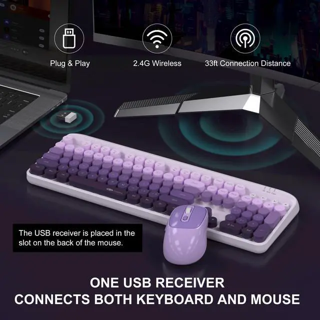 MageGee V920 Wireless Keyboard and Mouse Combo, 2.4G Full-Sized Retro Typewriter Keyboard with Round Keycaps & Auto-Sleep Mode, Cute Computer Keyboard and Cordless Optical Mouse for Laptop/PC (Purple)