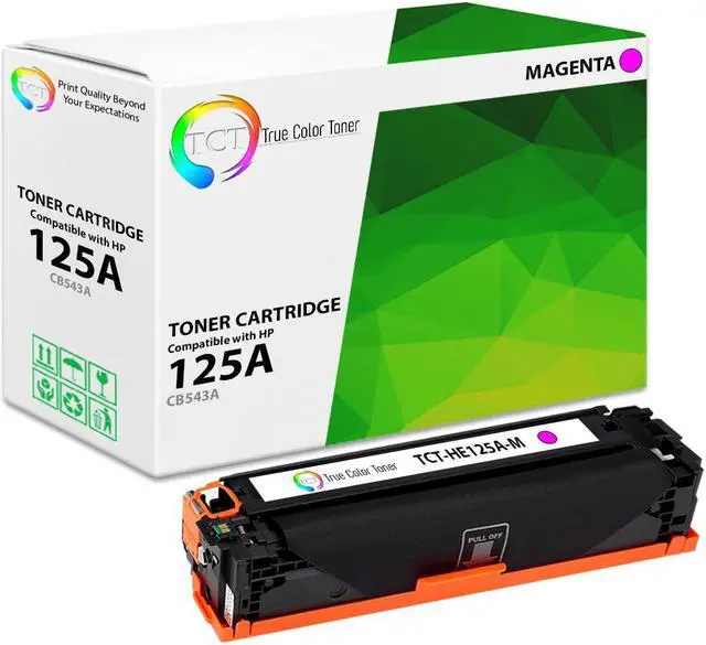 TCT offers quality HP 125A CB543A compatible replacement cartridges that fit effortlessly into your printer. You will find crisp, clear prints with consistently dark tones and sharp images in every single print job. Get professional quality prints every time and save a bundle with True Color Toners high quality printing supplies!