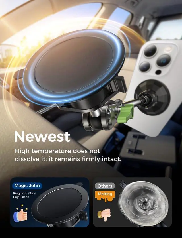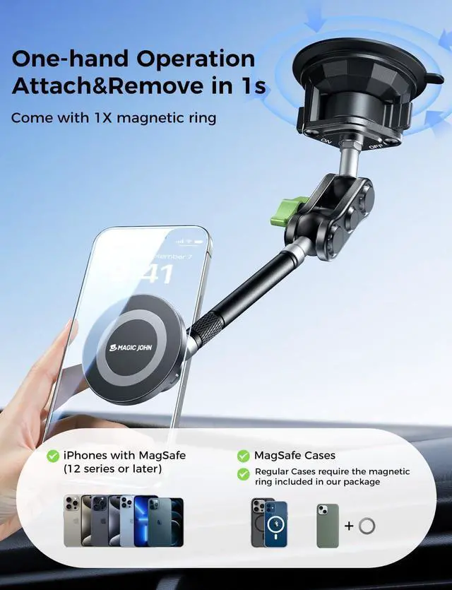 [Designed for MagSafe] 2025 MAGIC JOHN Best iPhone car mount is designed for iphone 16/15/14/13/12 series and official MagSafe cases and other magnetic phone cases and can be fixed directly to these phones without the need to affix metal plates. All Android Phones Will Work: Metal rings are provided; they fit cases and other phones without MagSafe.