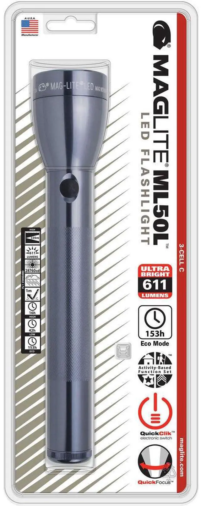 Be prepared for any situation with the ML50L 3-Cell C LED Flashlight in sleek gray, encased in blister packaging for optimal protection. This durable and reliable flashlight, crafted by the reputable brand Maglite, is an essential tool for professionals, outdoor enthusiasts, and homeowners alike. Designed for versatility, this high-quality flashlight offers an impressive lumen count of 611, ensuring a bright and powerful light source. Whether you're navigating through a dark workspace, setting up camp under the stars, or handling an unexpected power outage at home, the ML50L LED flashlight is your reliable companion.