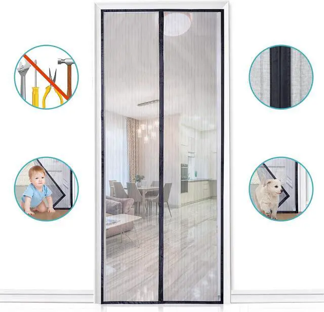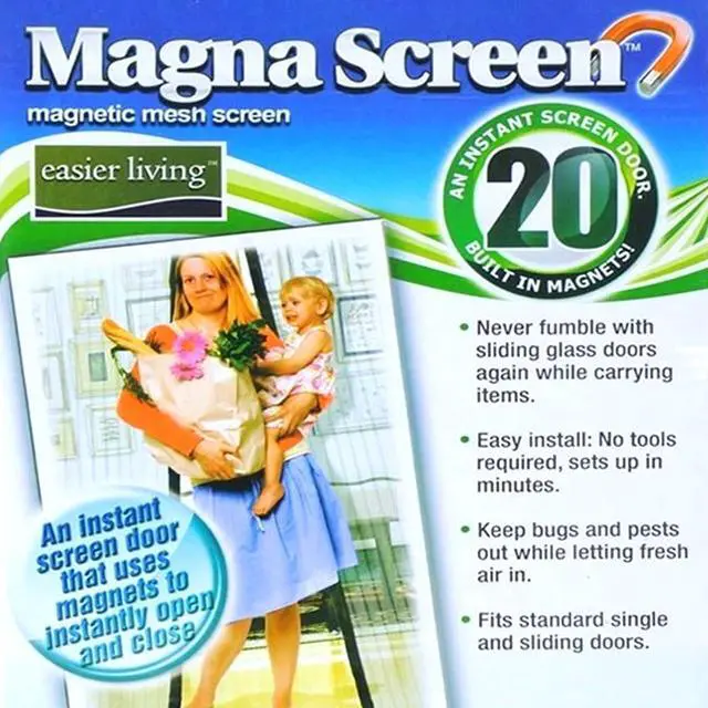 Never fumble with sliding glass doors again while carrying items. Easy to install no tools required set up in minutes. Keeps flies bugs and pests out while letting in fresh air. It uses 20 high power magnets to open securely and magically close behind you. Fits standard single and sliding doors measuring 83 inches into a 19.5 inch screen panel with 12 hook and loop strips and 20 wood tacks. The magna mesh screen has 20 magnets. Box may vary. 2 Pack