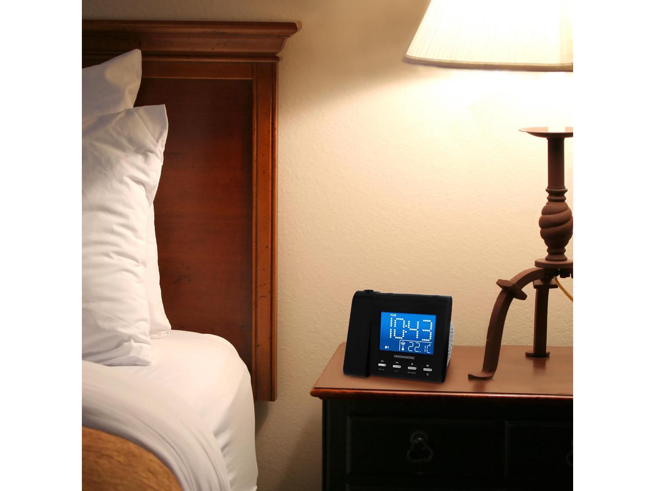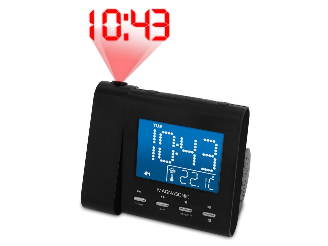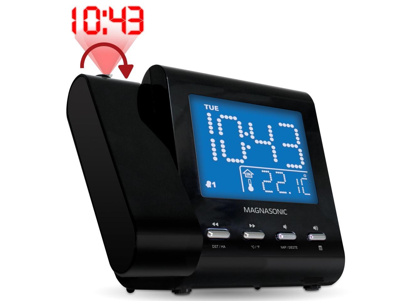 Magnasonic Projection Alarm Clock with AM/FM Radio, Battery Backup, Auto Time Set, Dual Alarm, Nap/Sleep Timer, Indoor Temperature/Date Display with Dimming & 3.5mm Audio Input - Black (EAAC601)
