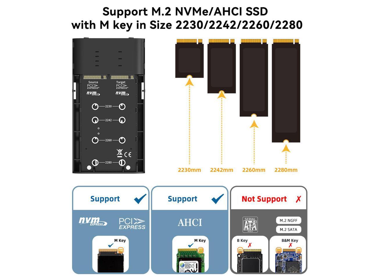 - Compatibility: Work with M.2 NVMe and M.2 AHCI SSDs in size 2230/2242/2260/2280 (DOES NOT SUPPORT M.2 SATA SSD). Please note that the TARGET slot supports only M.2 NVMe SSD, the SOURCE slot supports both M.2 NVMe and AHCI SSD.
