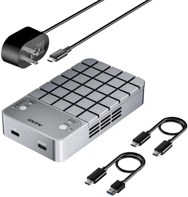 Feature5V 3A Power Adapter / Dual 31.5inch Data Cables: 20Gbps USB-C to USB-C & 10Gbps USB-C to USB-A / Silicone and Aluminum Thermal Pads / Max 16TB Capacity