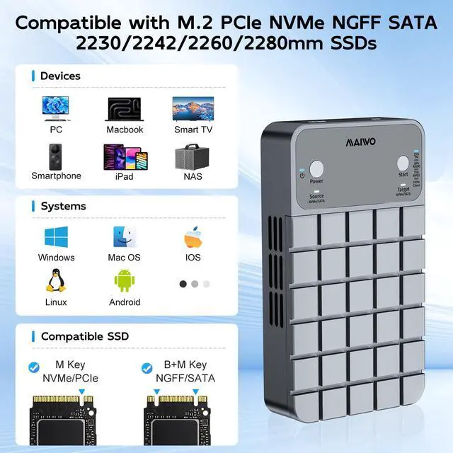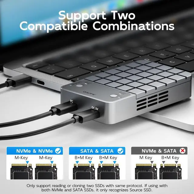 Compatibility M.2 NVMe & SATA SSDSpecifically designed for M.2 NVMe M Key and M.2 SATA B+M Key SSDs in sizes 2230/2242/2260/2280mm. Compatible with USB4/3.2/3.1/3.0/2.0, Windows, macOS, and Linux. Supports UASP (Win 8.1+). Note: For cloning, both SSDs must be the same protocol (NVMe to NVMe or SATA to SATA).