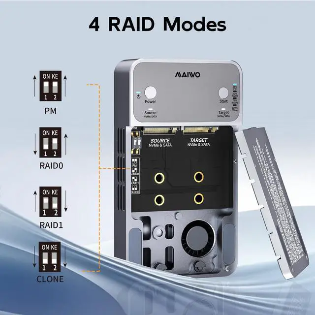MAIWO Dual Bay RAID Enclosure for M.2 NVMe SATA SSD with Clone RAID 0 RAID 1, USB C 3.2 GEN2x2 20Gbps, M.2 SSD Cloner Duplicator with Cooling Fan, Dual Data Cables, 5V 3A Power Adapter, Aluminum