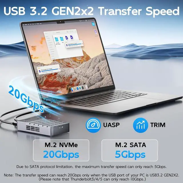 20Gbps Transmission SpeedThe m.2 ssd raid enclosure equipped with USB 3.2 GEN2x2 interface and JMS586R chipset, delivers exceptional data transfer speeds of up to 20Gbps and supports UASP and Trim. Ensure your m.2 ssd operate at their peak potential for maximum productivity and efficiency. Whether you're transferring large files or backing up critical data, this m.2 nvme/sata reader ensures lightning-fast performance, significantly reducing wait times and improving productivity.