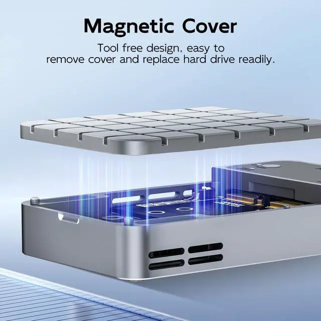 Tool FreeThe magnetic cover of this dual bay nvme enclosure makes it easy to remove the cover and replace SSD readily, save you valuable time and effort.