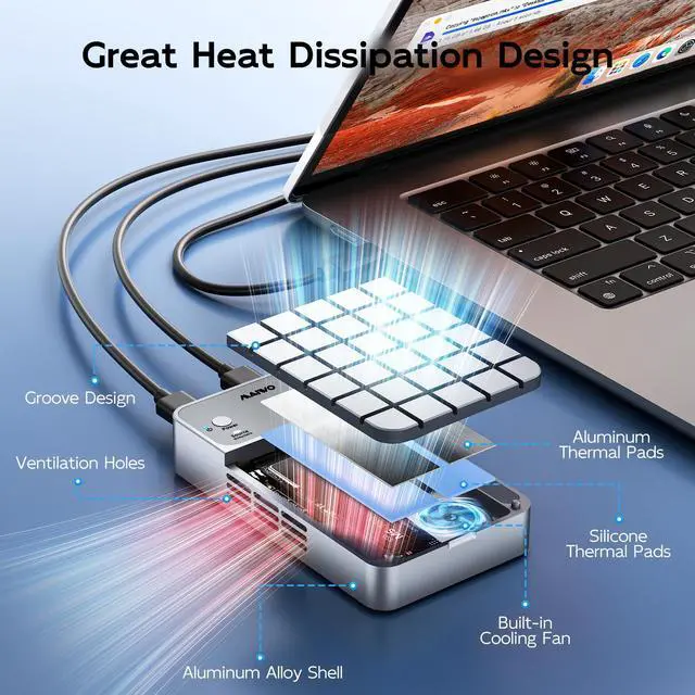 Built-in Cooling FanThis m.2 ssd duplicator features cooling fan, aluminum alloy shell, silicone and aluminum cooling pads for efficient heat dissipation. The design not only protects your SSD but also maintains optimal operating temperatures, ensuring stable performance even during extended use.