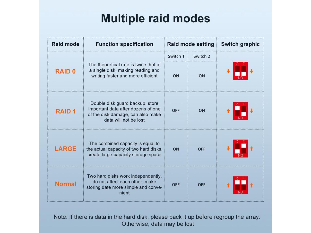 - 4 Raid Modes: The hard drive enclosure has 4 Raid modes, no matter you want to back up your data, quickly transfer data, read&write two HDD at the same time or expand your storage capacity, this enclosure is what you needed, easy to set the modes.