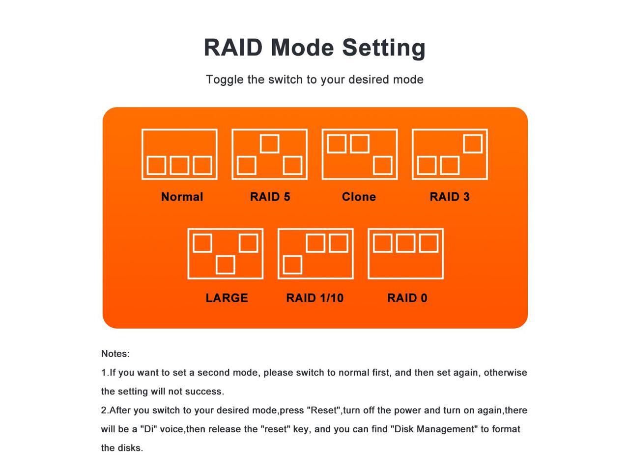 - 7 RAID Modes: This 4 bay external hard drive enclosure is capable of RAID 0,1,3,5,10 and other modes like CLONE, LARGE, NORMAL.