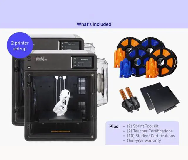 • Includes: (2) Sketch Sprint 3D Printer, (4) Spools of PLA, 0.25kg, (2 Blue, 2 Orange), (2) Build Plates, (2) Nozzles, (2) Spool Covers, (2) US/EU Power Cords, (2) Sprint Tool Kits (Grease, Needle, Screwdriver, Snips, Hex Key Kit), 1-Year Warranty, (2) Teacher Certification, (10) Student Certification.