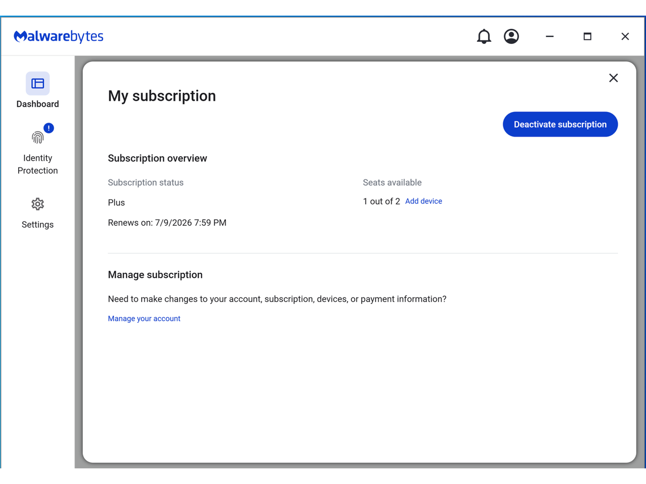 - Malwarebytes Premium Security and Privacy VPN (Plus subscription) gives you real time protection 24/7 against malware, including viruses, ransomware, and spyware, without slowing you down.