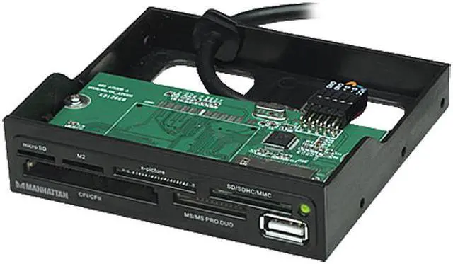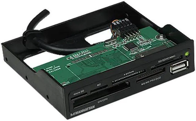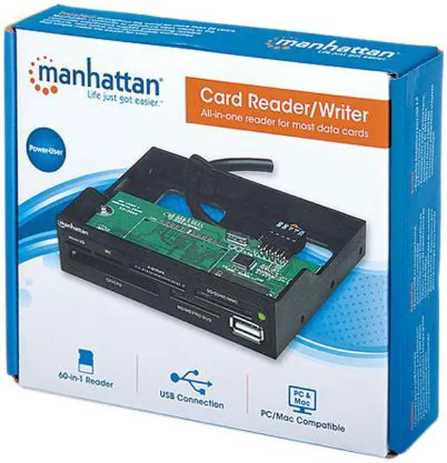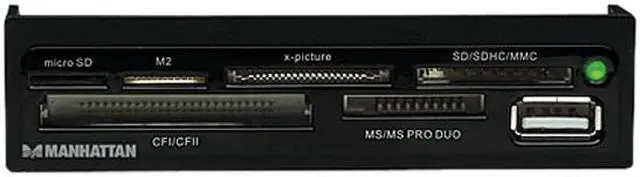 The MANHATTAN Multi-Card Reader/Writer supports most card formats to easily download and transfer digital images and files across many of today's popular flash memory cards. Compatible with up to 60 of types of CompactFlash, Microdrive, Magicstor, Memory Stick, MagicGate, SecureDigital, Multimedia, XD and more, the MANHATTAN Multi-Card Reader/Writer quickly installs into a 3.5" bay.