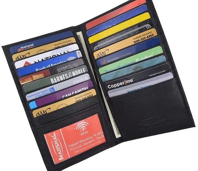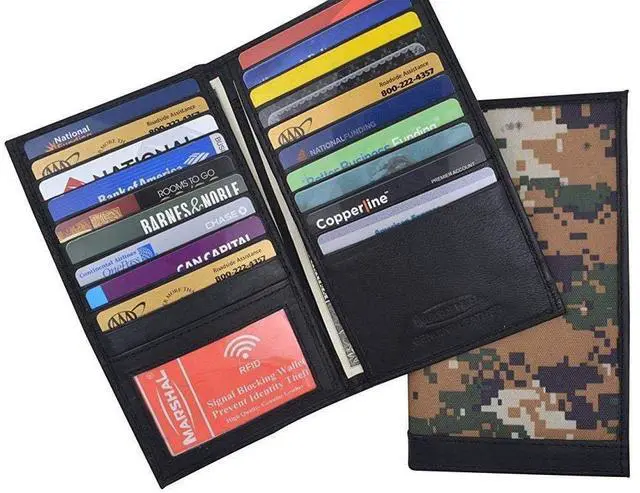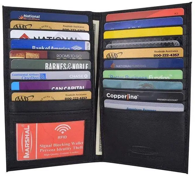 - MORE SLOTS MORE CONVENIENCE: Hold one of our Marshal wallets in your hands today, open it and discover its many slots and compartments. 19 slots for your credit or debit cards, your shopping cards, or gift shopping cards. 2 large bill compartments that will carry your money safely and 1 ID window. Place your ID or drivers license