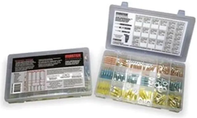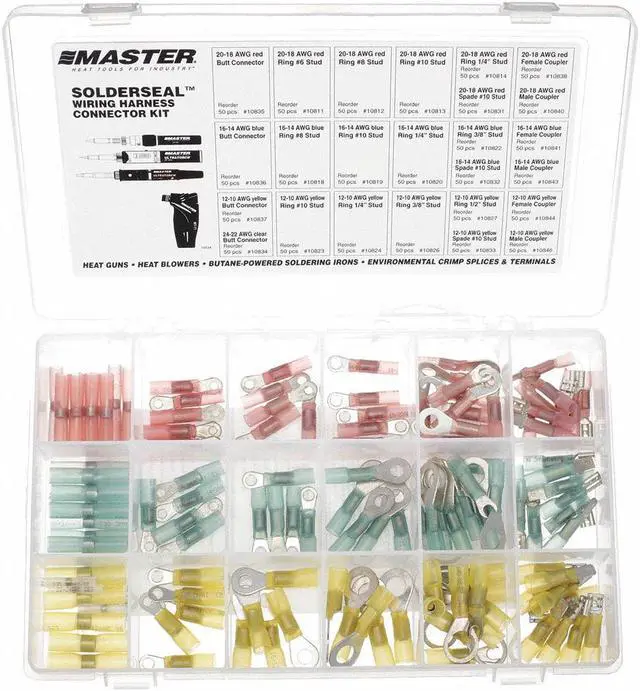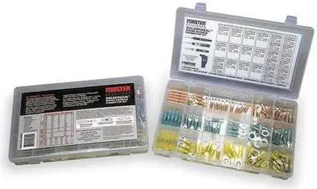 Solder and Heat-Seal Large Assortment Kit, For Conductor Material Aluminum, Copper, Insulation Material Polyolefin, Maximum Operating Temperature 230 Degrees F, Minimum Wire Size 24 AWG, Maximum Wire Size 10 AWG, Number of Pieces 135, Termination Style Crimp, Tools Included None, Manufacture Model Numbers Included 11543, 11544, 11545, 11825, 11826, 11827, 11828, 11829, 11830, 11831, 11832, 11833, 11834, 11835, 11836, 11837, 11838, 11839, 11840, 11844, 11845, 11846, 11847, 11848, 11849.