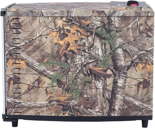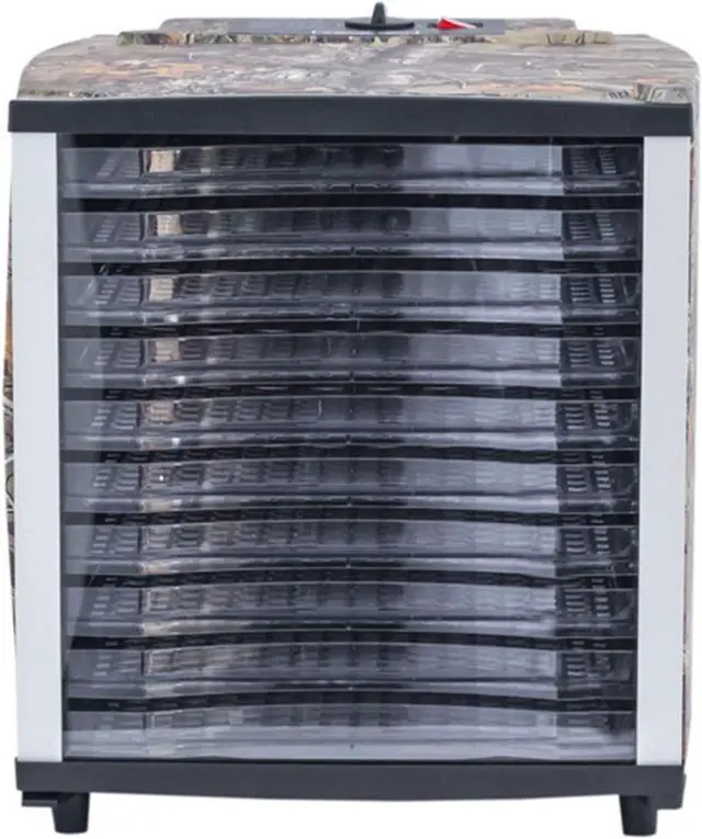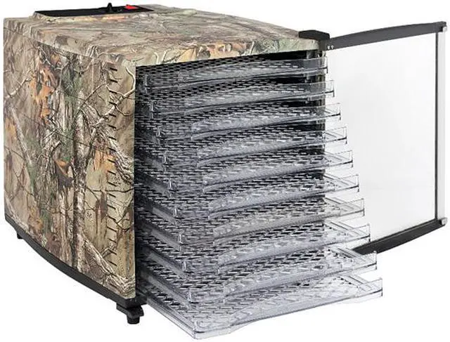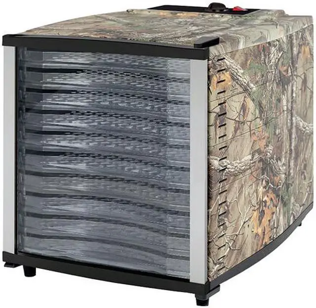 1,703 sq. in. of drying space Built-in temperature control from 100 Degree to 160 Degree for all your dehydrating needs Clear viewing door to check on food while the temperature stays constant Rear-mounted fan for even air circulation Non-stick trays ensure food will remove with ease Indicator light lets you know when the dehydrator is on Create delicious treats such as jerky, fruit roll-ups and yogurt Authentic Realtree Xtra camo pattern