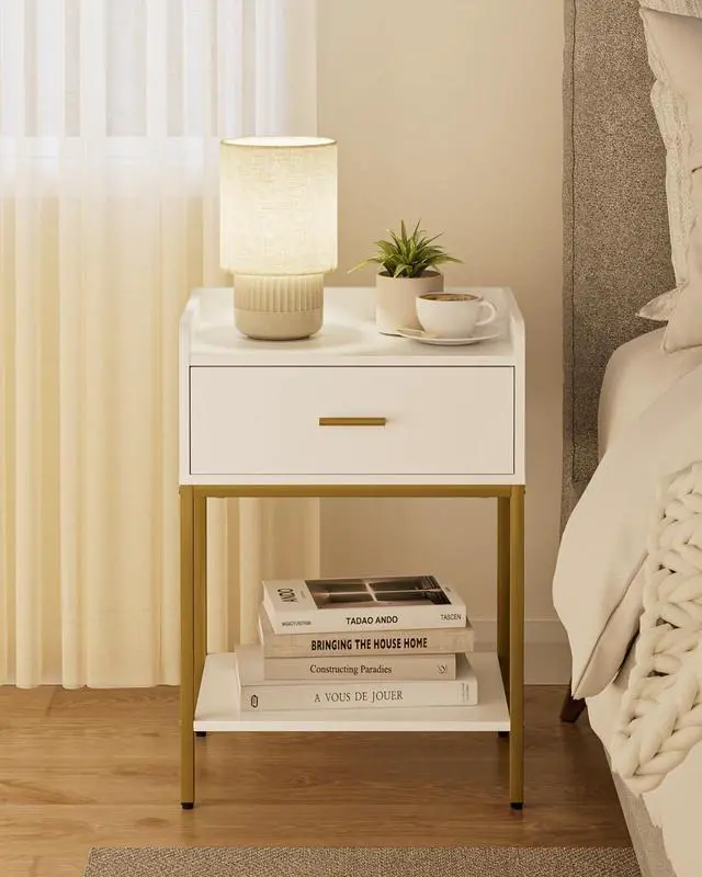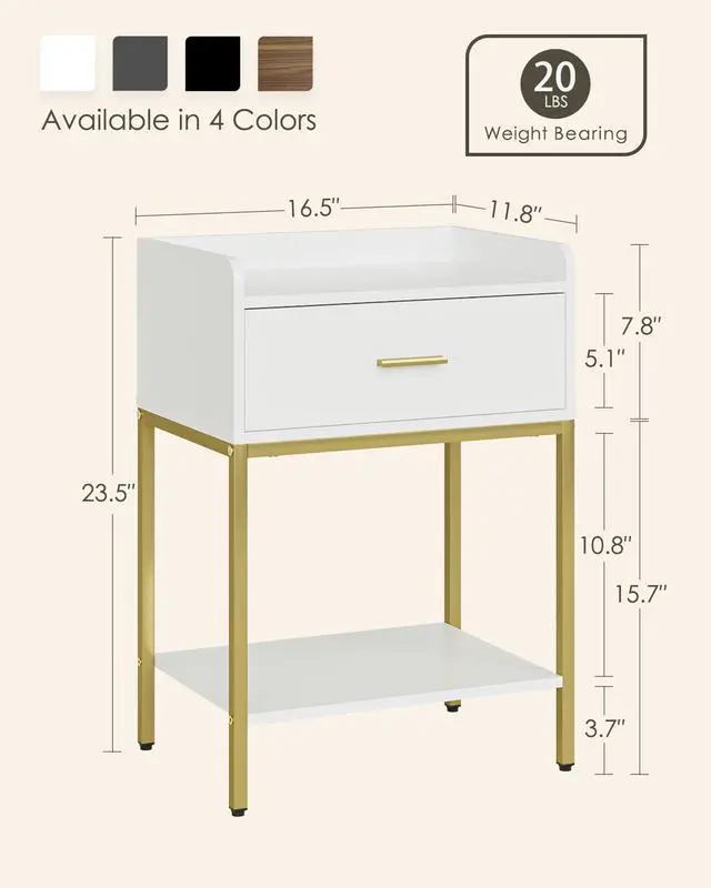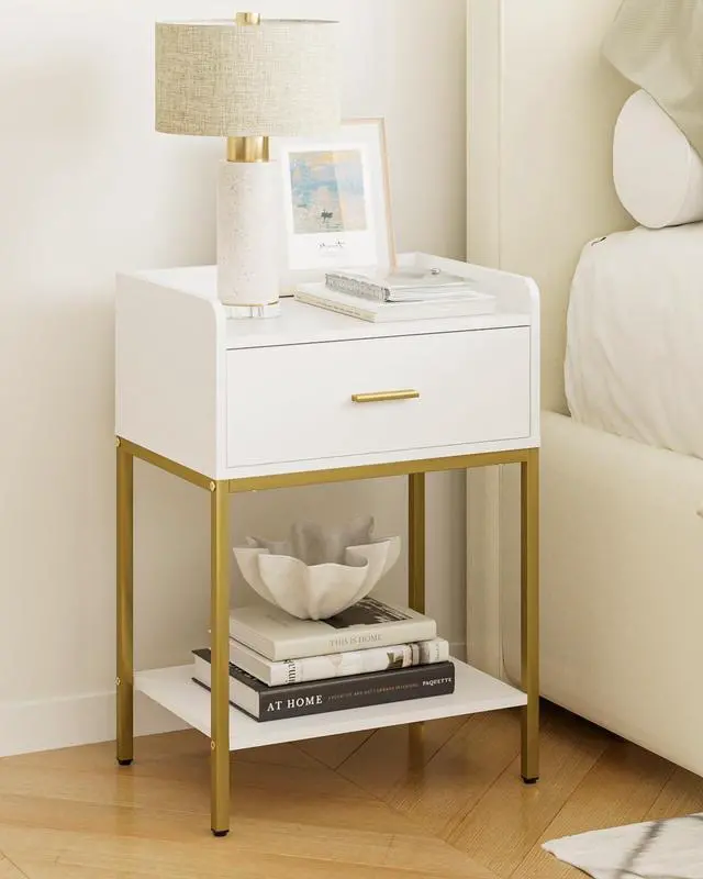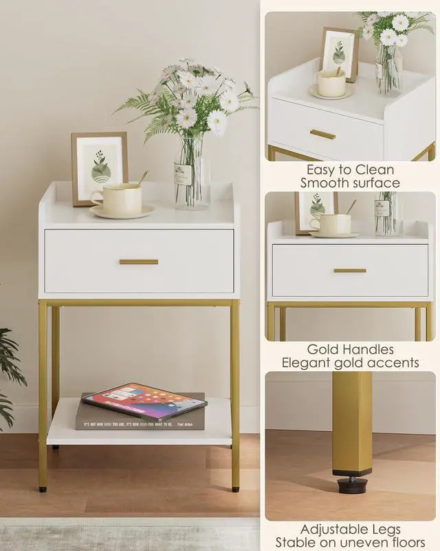 Masupu Gold and White Nightstand Wide Desktop Equipped with anti slip edges