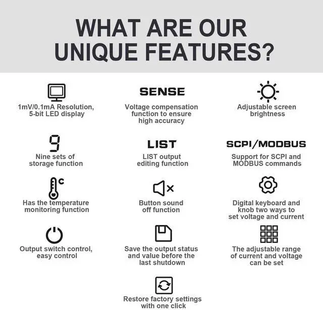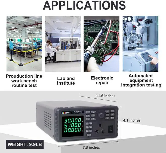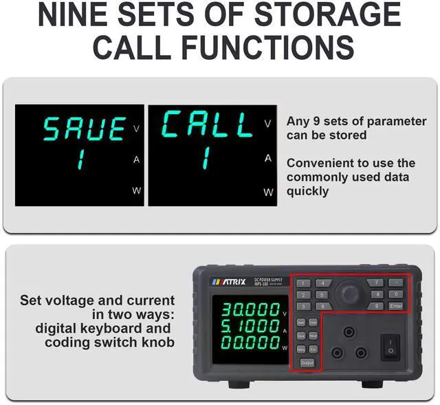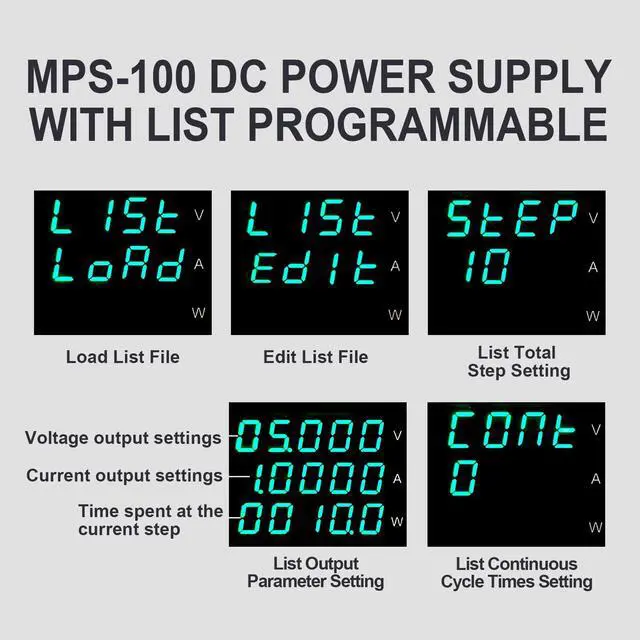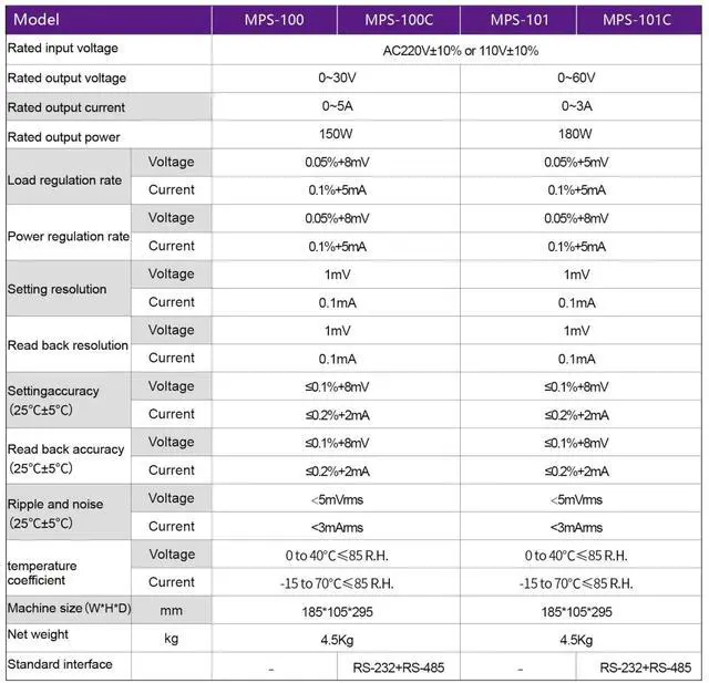 MPS-100 Series programmable DC power supply with low ripple and noise, 1mV/0.1mA high resolution, 9 sets of preset storage, single machine List sequence programming, LED display brightness adjustable, capable of monitoring the internal temperature, and optional RS-232+485 communication interface.